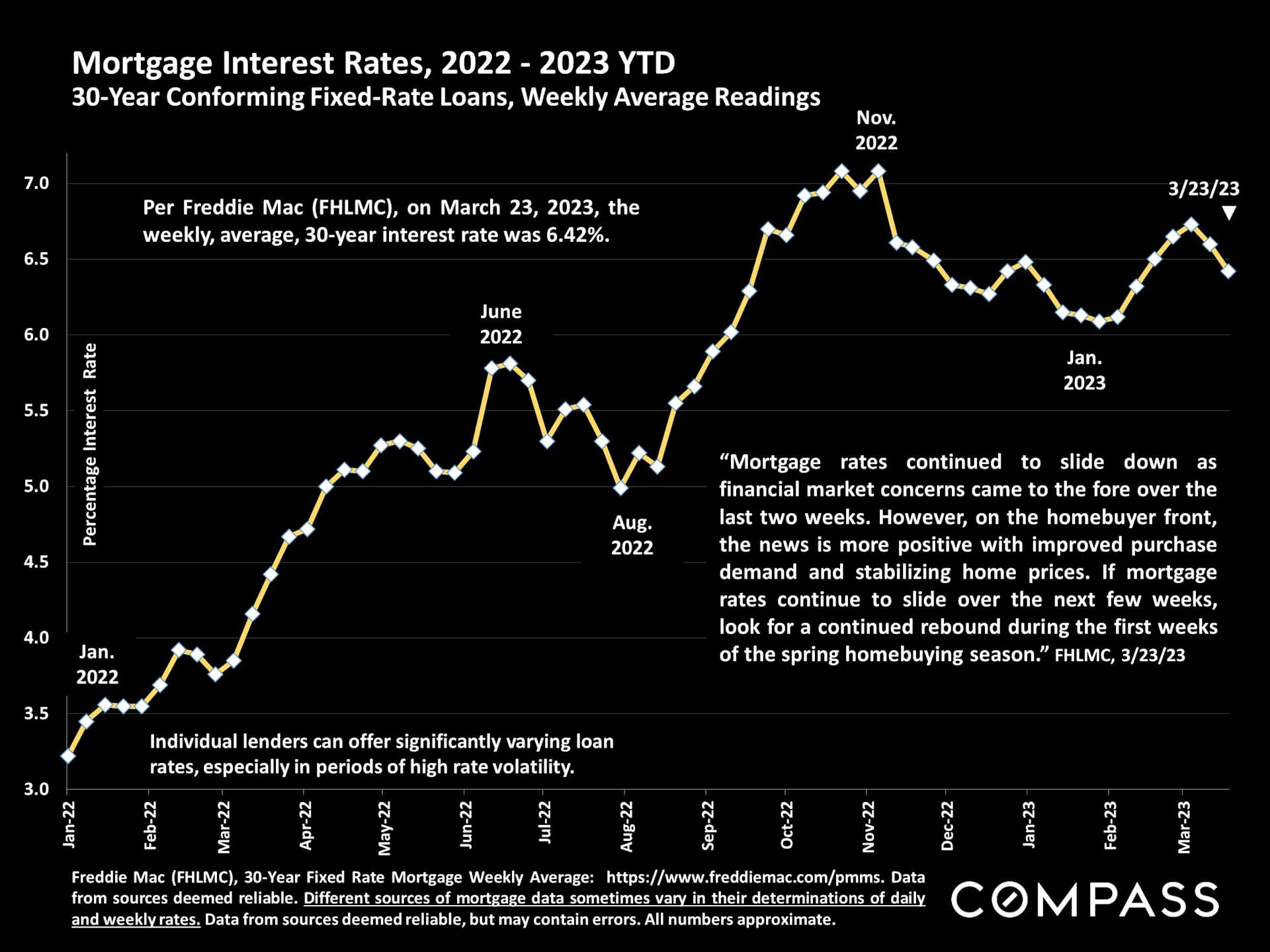Last week the Fed raised interest rates by a quarter point in an effort to fight stubbornly high inflation. The Fed does not set the interest rates on mortgages directly but its actions influence them. Mortgage rates tend to track the yield on 10-year US Treasury bonds, which move based on a combination of anticipation about the Fed's actions, what the Fed actually does and investors' reactions. When Treasury yields go up, so do mortgage rates and when they go down, mortgage rates tend to follow. The recent banking turmoil has helped to cool inflation. While inflation is still quite high, it is slowing and analysts are anticipating a much slower economy over the next few quarters which should further bring down inflation. This is good for mortgage borrowers who can expect to see rates retreating through the end of the year, according to Mike Fratantoni, Mortgage Bankers Association senior vice president and chief economist.